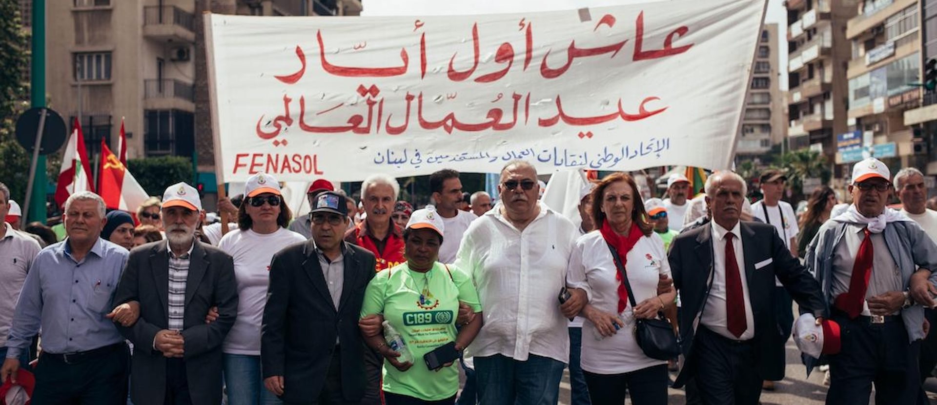 © Chief members of FENASOL, the Federation of Worker and Employee Trade Unions are seen taking part during the labour day protest. May is "International labour day" also known as May Day and it is a day for the workers to demand for more rights and against corruption, the misuse of public funds by the Lebanese government. Beirut, 1 May 2019 (Photo by Adib Chowdhury / SOPA Images/Sipa USA)